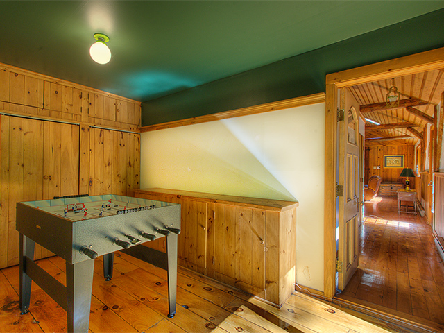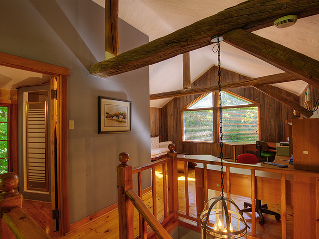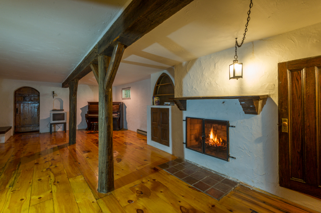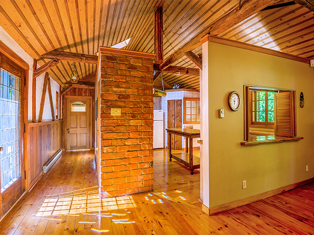 The main room has a beautiful brick fireplace. Old beams serve as roof structure. The floors of the entire house are knotty pine