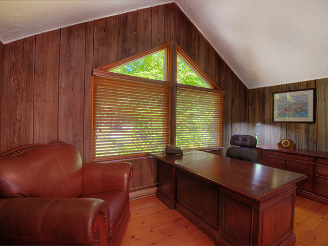 A business office is housed on the 2nd floor, it has a view on the pool and the backyard area. The desk and credenza are mahogany. They can be purchased separately, and so can the leather chair.